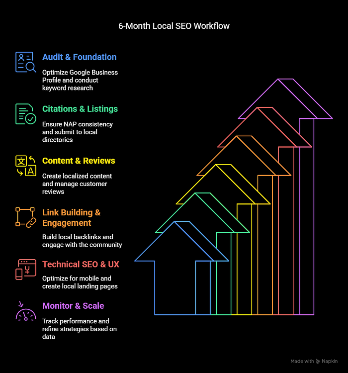 Want more local customers finding your business online? A structured Local SEO strategy is the key! Here’s a proven 6-month workflow to boost your rankings, drive traffic, and increase conversions.